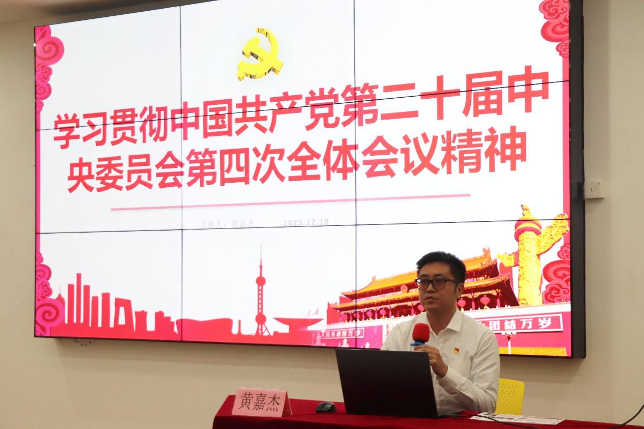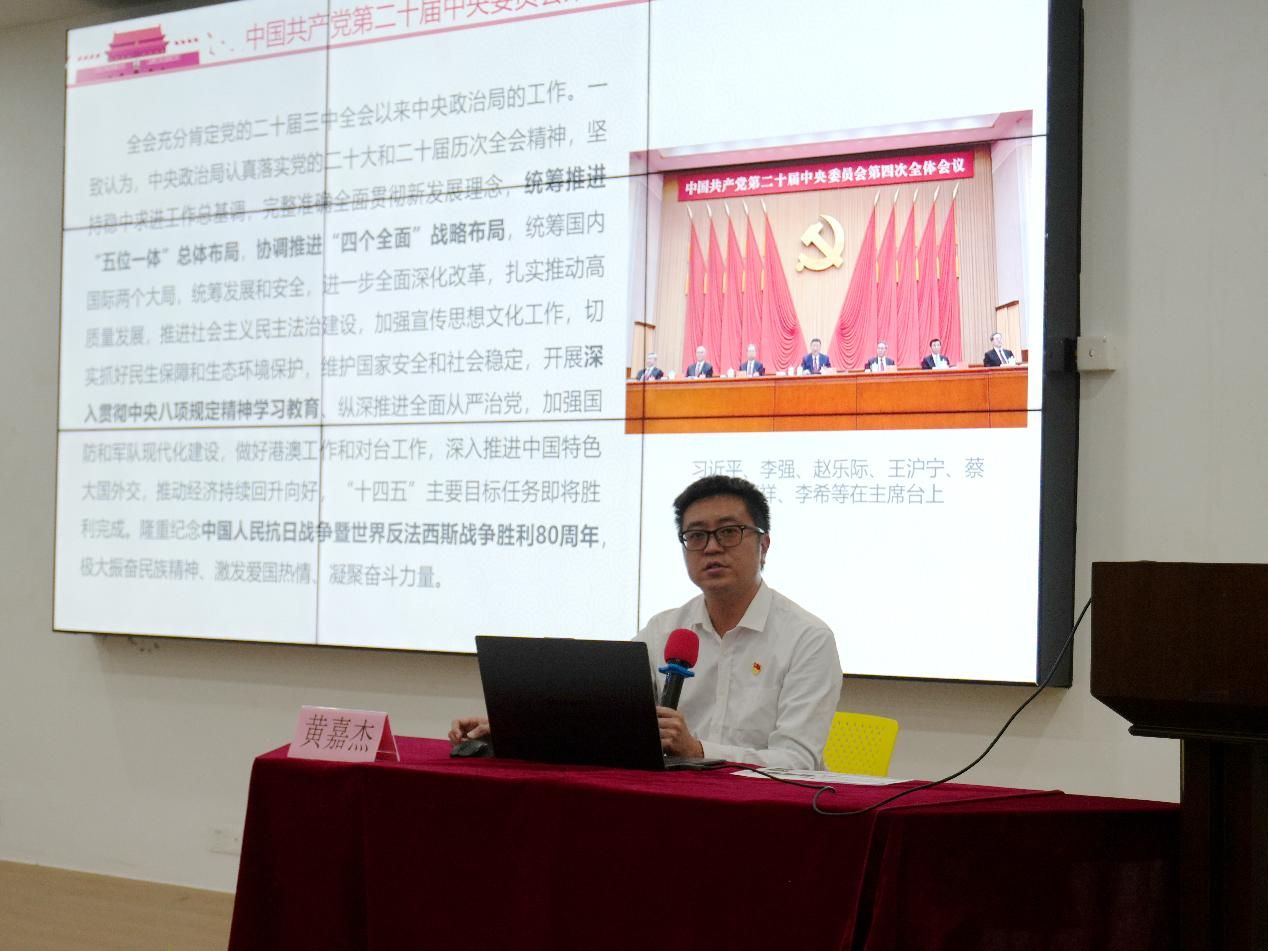 黄嘉杰以“学习贯彻中国共产党第二十届中央委员会第四次全体会议精神”为题,为学员系统传达党的二十届四中全会精神,结合青年成长实际,鼓励学员将个人理想融入国家发展大局,一是以全会精神为指引,做理想信念的“追光者”,深学细悟党的创新理论;二是以专业为基石,做创新实践的“实干家”,将文化自信融入学科竞赛;三是以行动为号角,做服务社会的“排头兵”,在乡村振兴中贡献青春智慧。他号召全体学员将全会精神转化为成长动力,在专业学习中锤炼本领,在社会实践中厚植家国情怀,为教育强国建设注入青春动能,做社会主义文化的传播者与实践者,成长为坚定的青年马克思主义者。