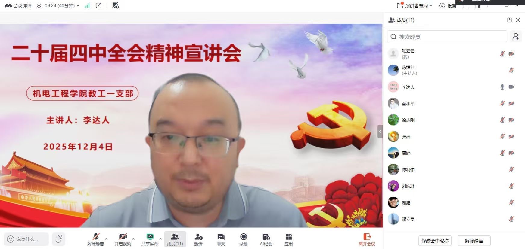 12月4日,机电工程学院(标准化学院)教工第一支部组织召开党的二十届四中全会精神线上学习会,会议由支部书记李达人主持,全体党员齐聚“云端”,共同参与学习。