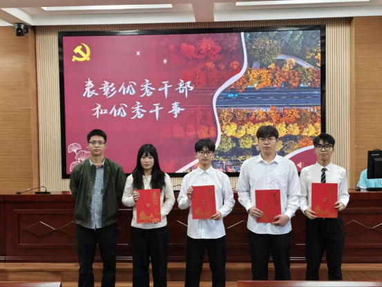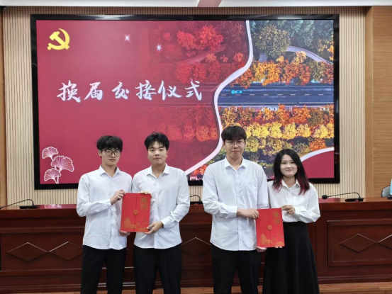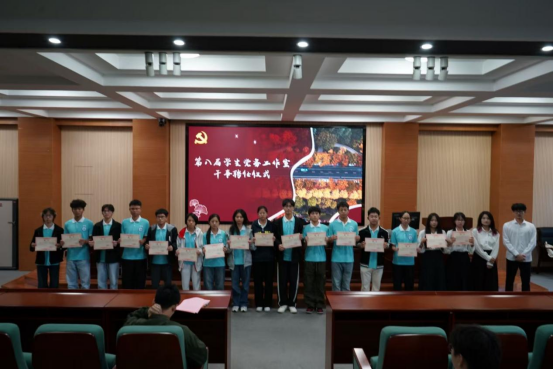 随后,主持人宣读第八届学生党务工作室干部名单,向新晋干部致以诚挚祝贺,勉励他们砥砺深耕、笃行不怠。换届交接仪式上,第七届与第八届负责人共同举起证书,完成责任与使命的交接,标志着第八届党务工作室正式接过工作重担,将开启党建工作新征程。