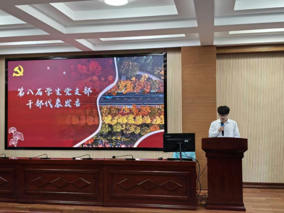 新一届学生党支部干部代表张博作表态发言。他分享了过往党务工作的实践经验与感悟,承诺将带领新成员传承优良作风,秉持“继往开来、守正创新”的理念,凝聚团队合力,推动党务工作室工作再上新台阶,为学院党建事业发展开拓更广阔的天地。