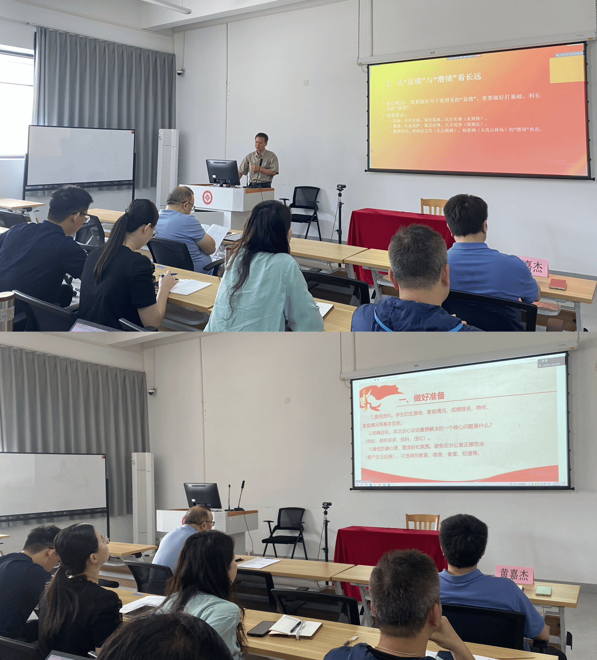 随后,优秀班主任李辉辉作“班主任如何与学生开展谈心谈话”专题党课分享。他结合多年一线育人经验,从谈心谈话的前期准备、沟通技巧、工作方法及后续跟进等方面进行系统讲解,重点阐释了因材施教与持续跟进的工作理念,针对不同年级学生特点精准施策,同时聚焦挂科、违纪、心理危机、经济困难等特殊群体开展帮扶;在工作规范层面,他按照“轻度-普通-严重”分级处置学生问题,及时反馈沟通,构建闭环管理机制,切实提升育人工作针对性与实效性。