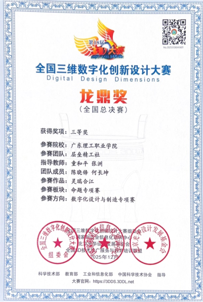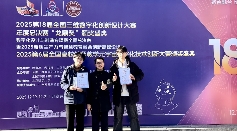 12月19日至21日,第18届全国三维数字化创新设计大赛“数字化设计与制造”专项赛全国总决赛在北京建筑大学举行。经过激烈角逐,由我院教师童和平、张洲指导,2023级工业设计专业学生陈晓锋、何长坤组成的“层垒精工社”团队荣获全国三等奖。