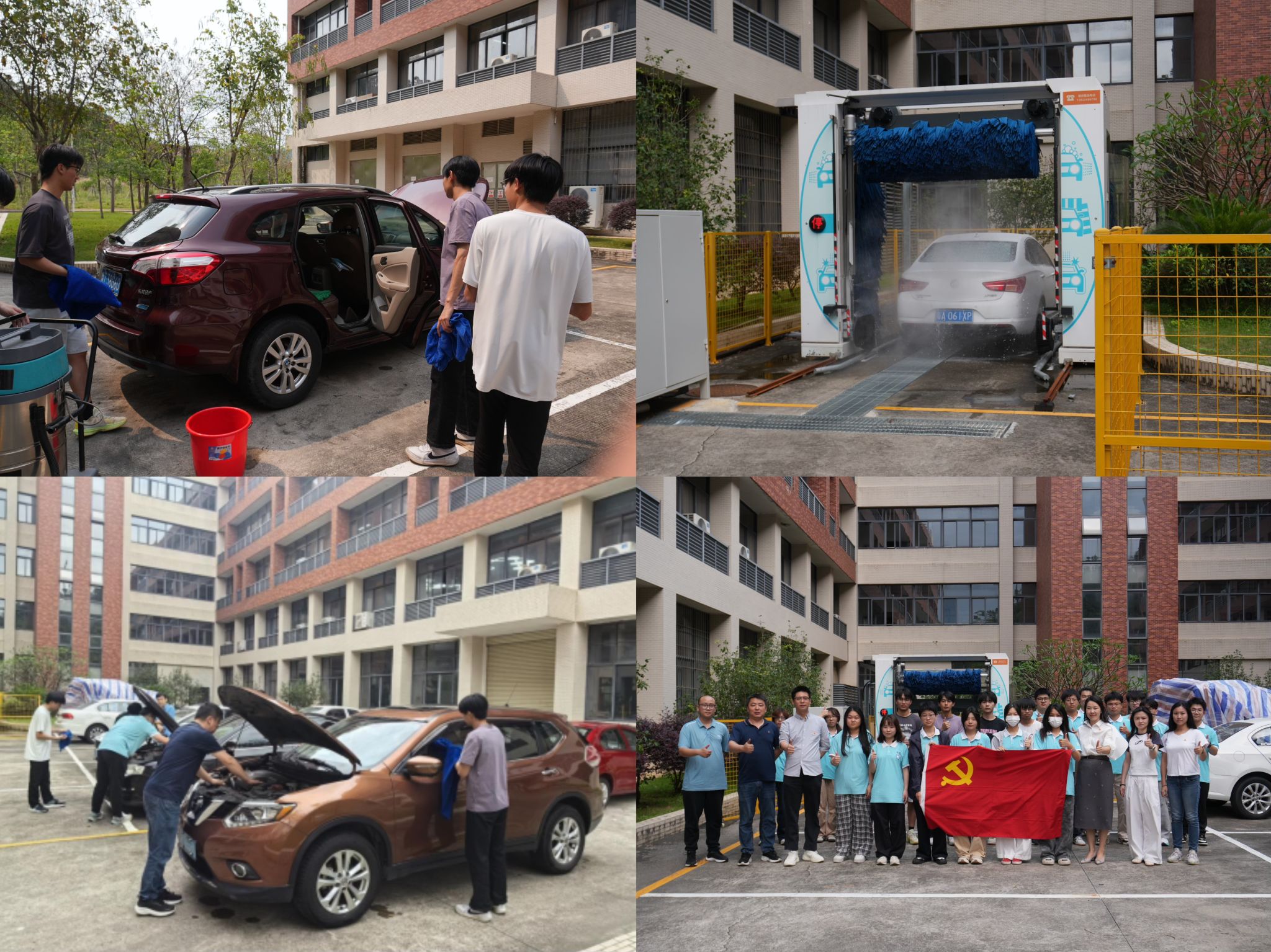 为深入贯彻落实学校“我为群众办实事”实践活动要求,积极探索“党建+专业”深度融合模式,充分发挥基层党组织战斗堡垒和党员先锋模范作用,机电工程学院(标准化学院)党总支于4月16日组织师生党员骨干,联合新能源汽车检测与维修技术专业师生团队,面向全校教职工成功开展了第一期“匠心服务·温暖校园”免费洗车公益服务活动。